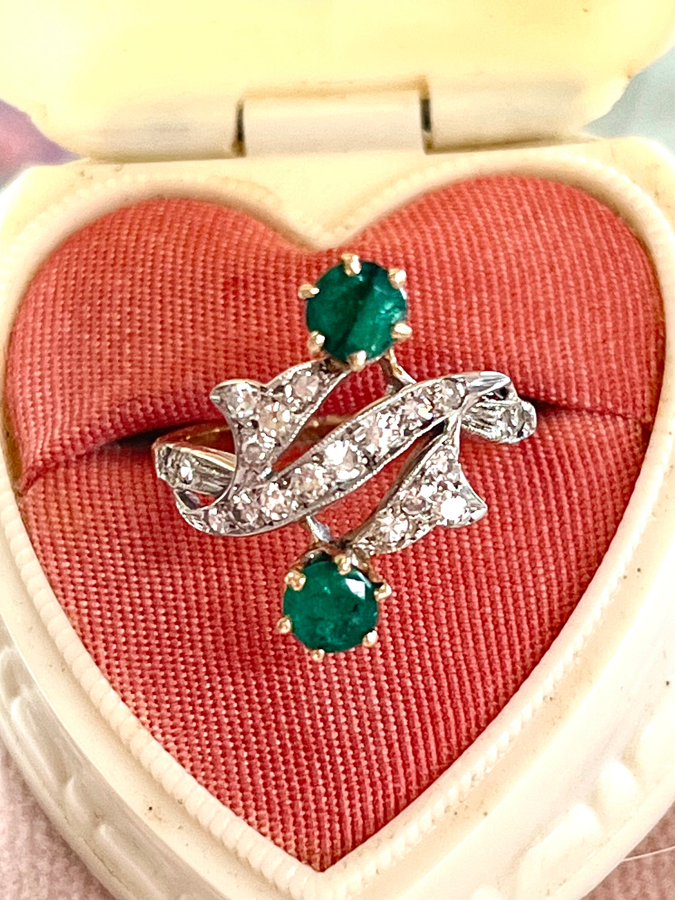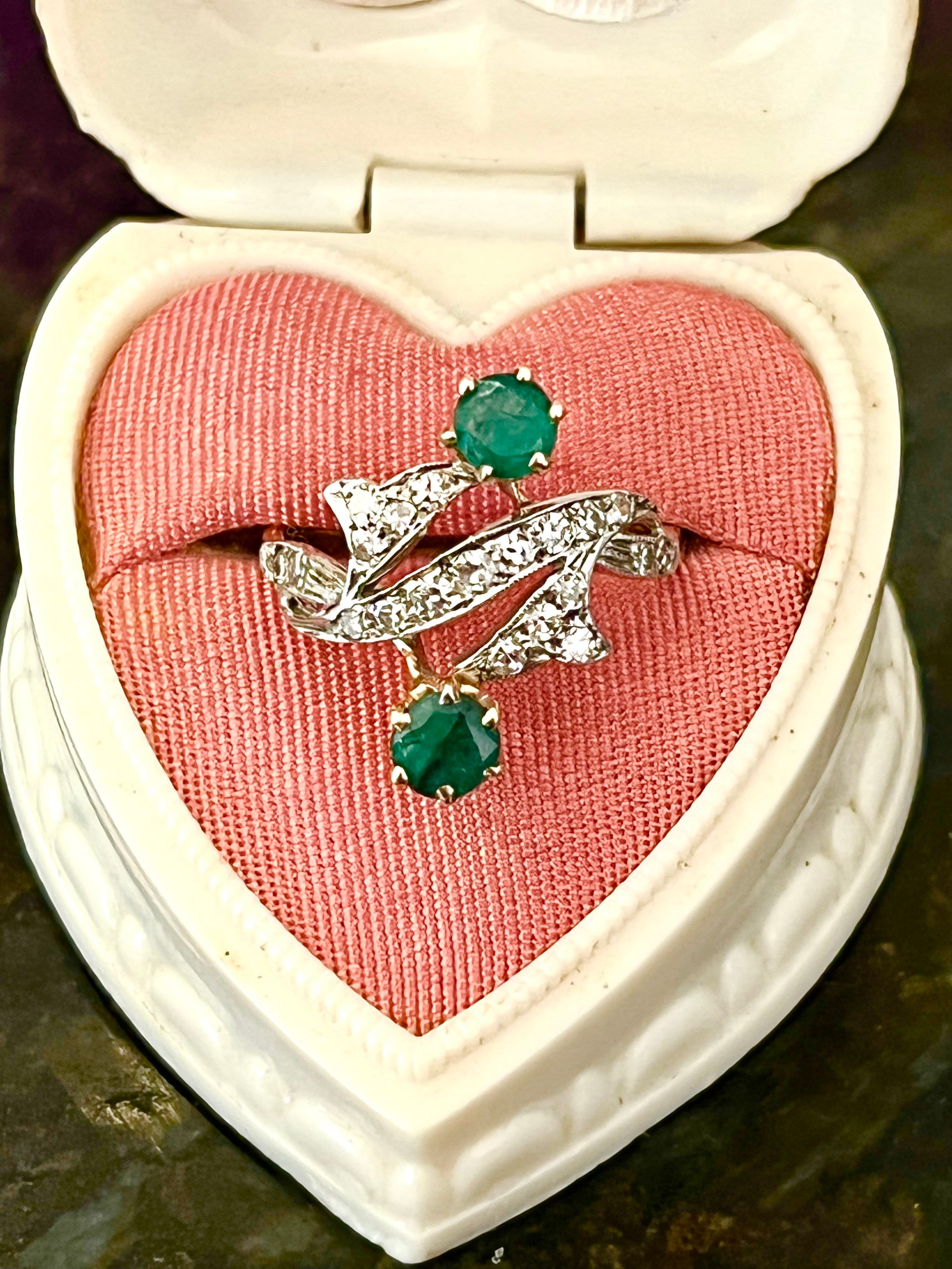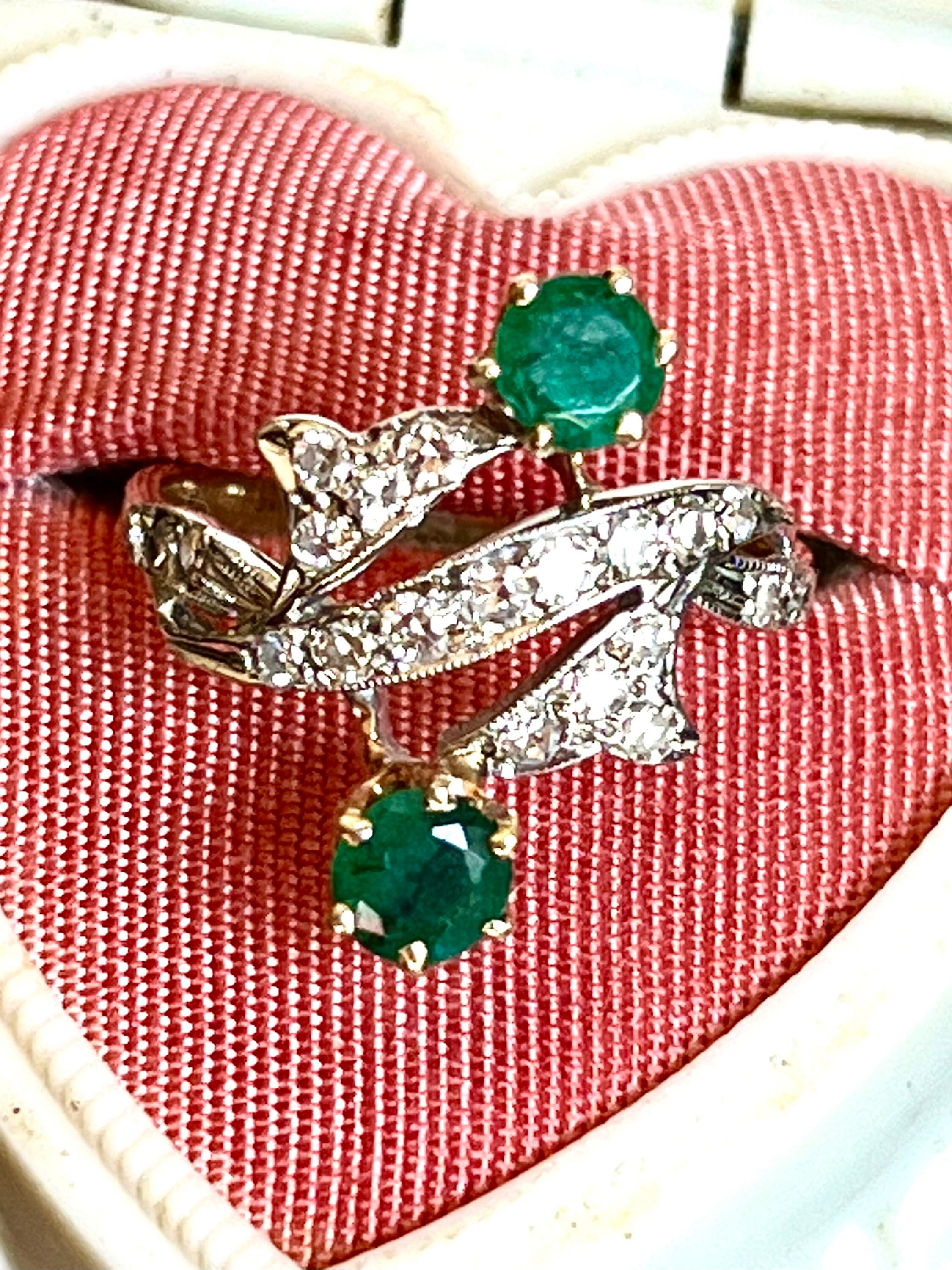 French Art Nouveau Toi Et Moi Emerald and Diamond Engagement Ring