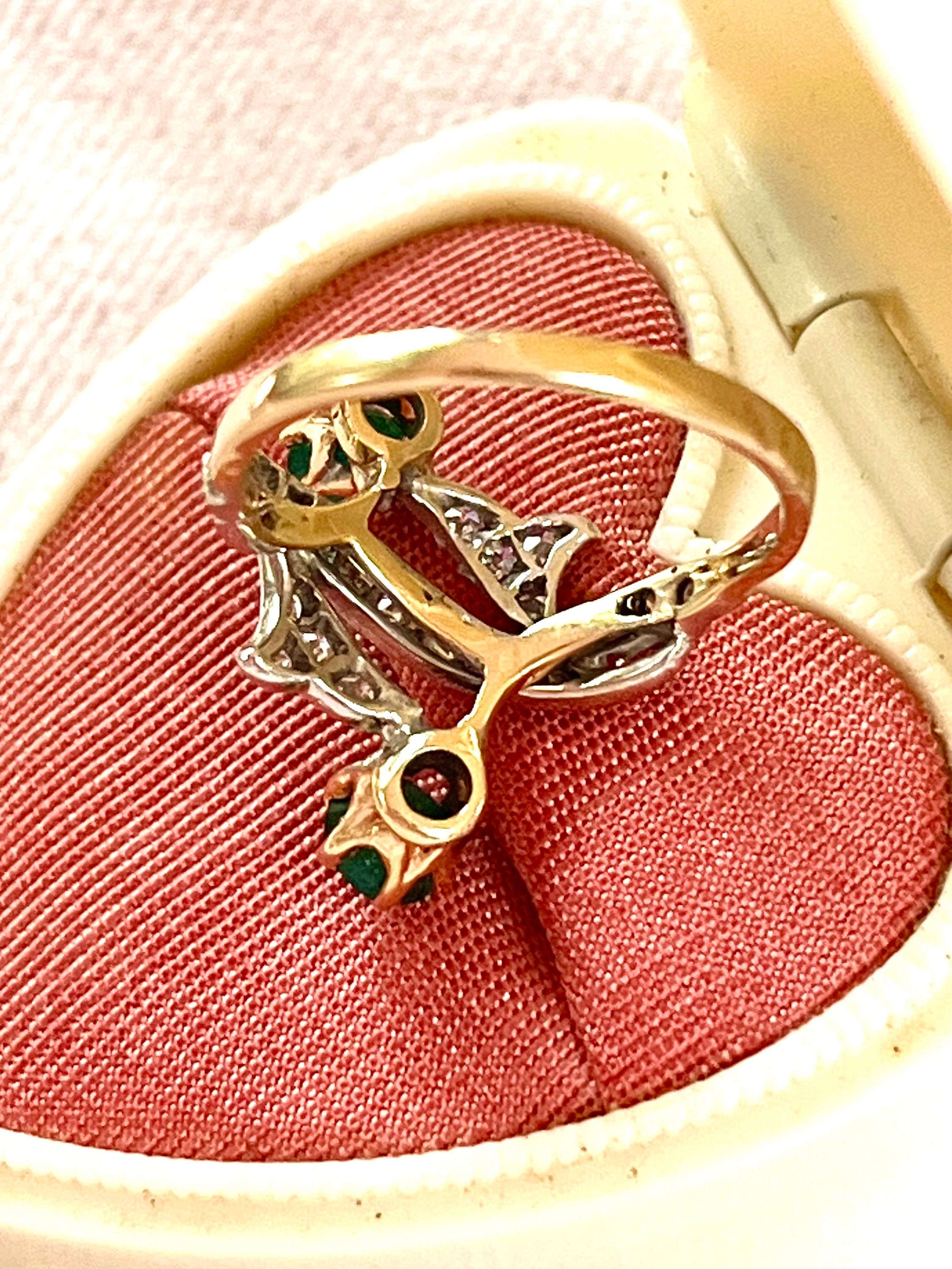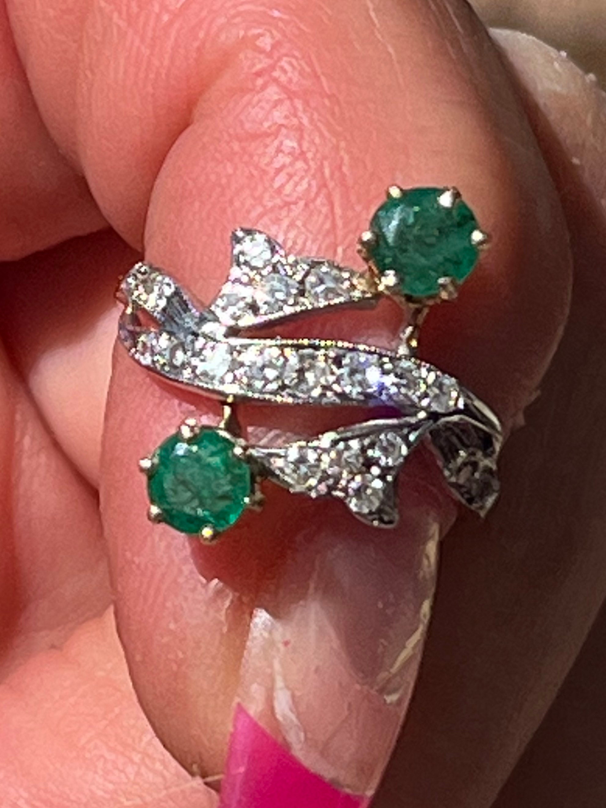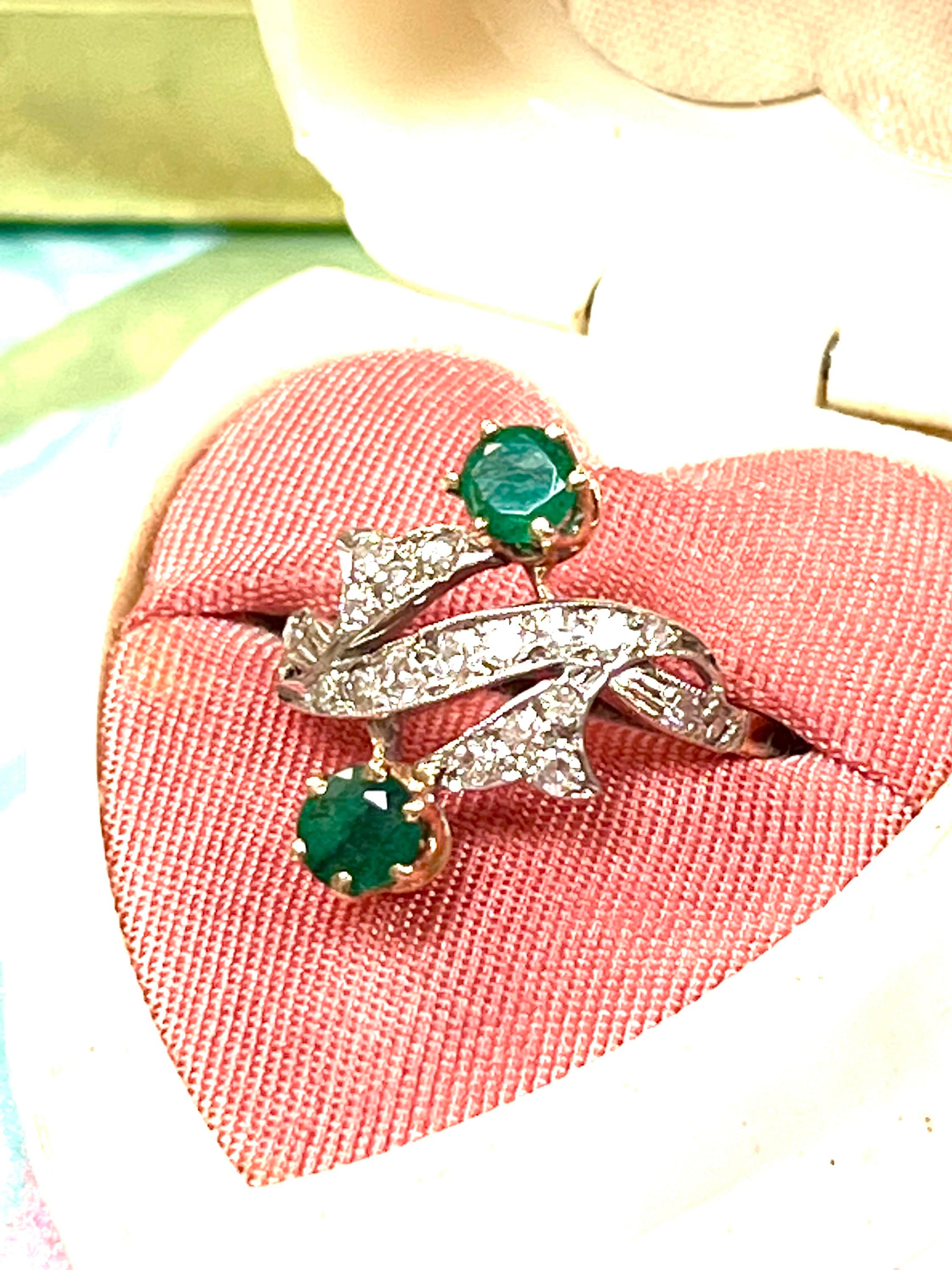 French Art Nouveau Toi Et Moi Emerald and Diamond Engagement Ring