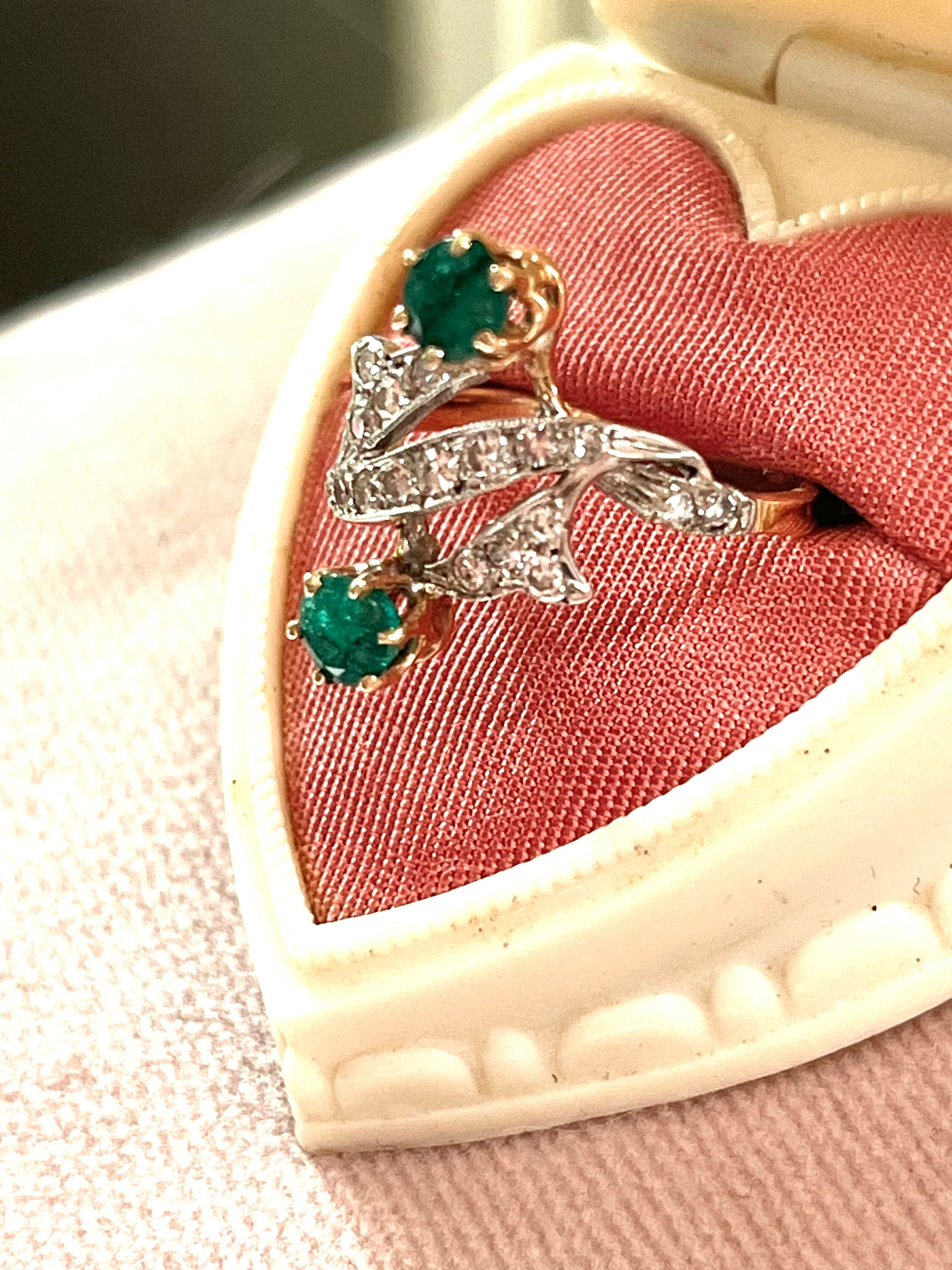 This is a spectacular French Toi Et Moi emerald and diamond ring worthy of heirloom quality.